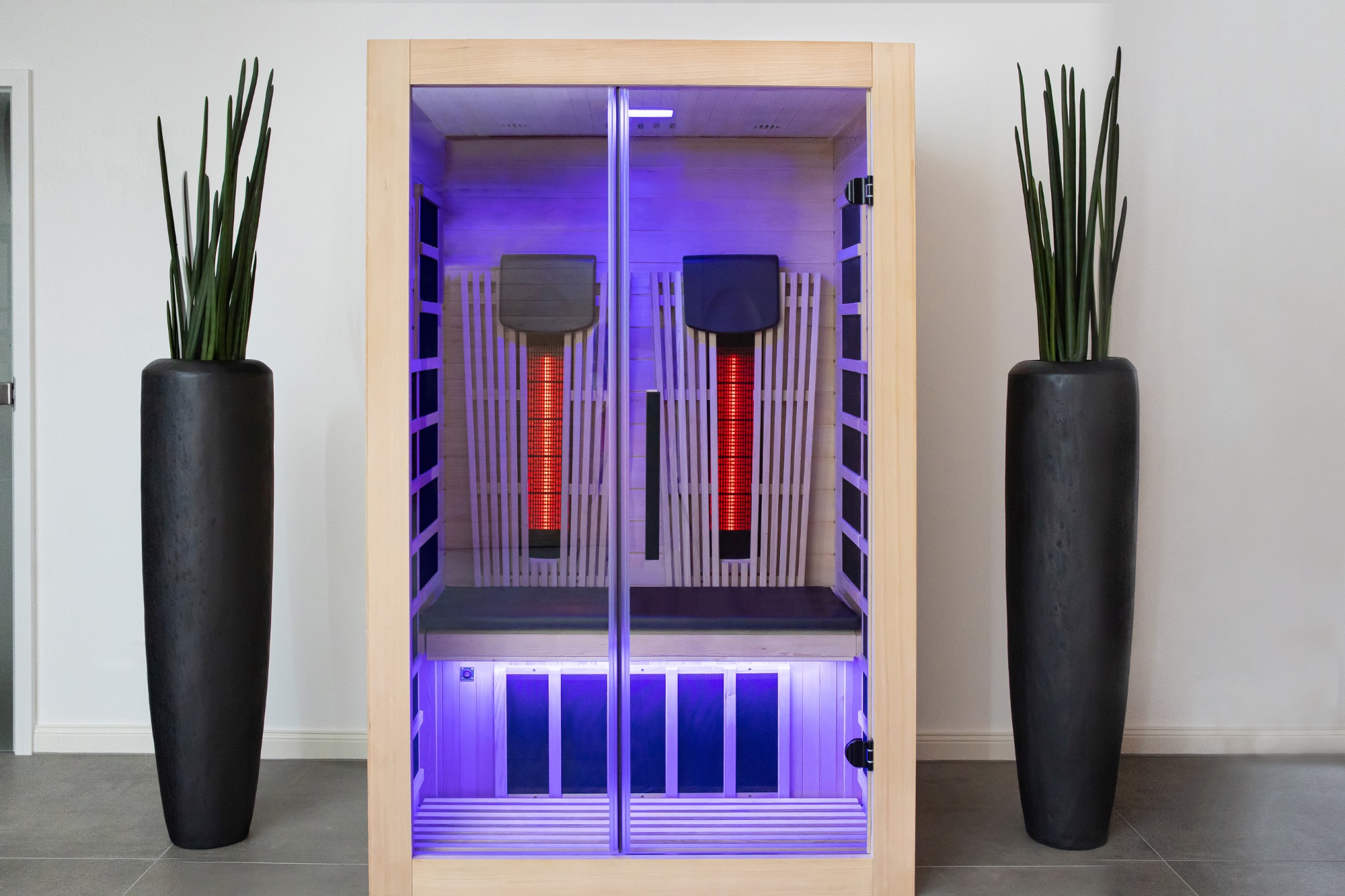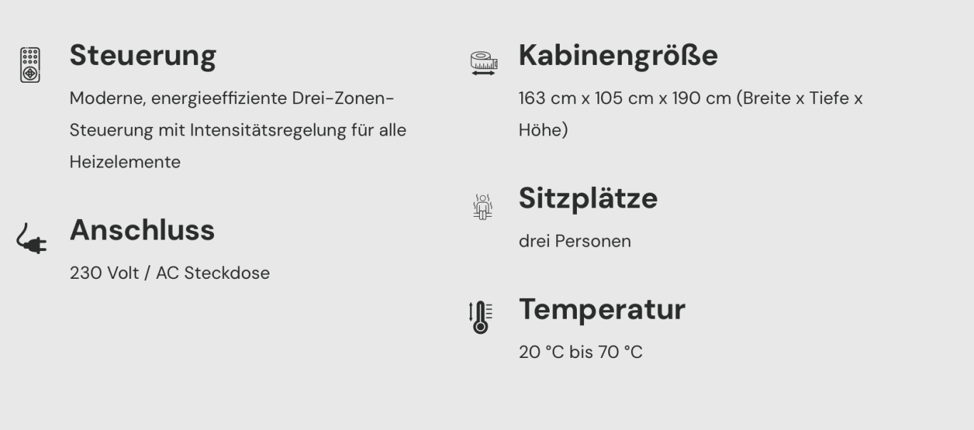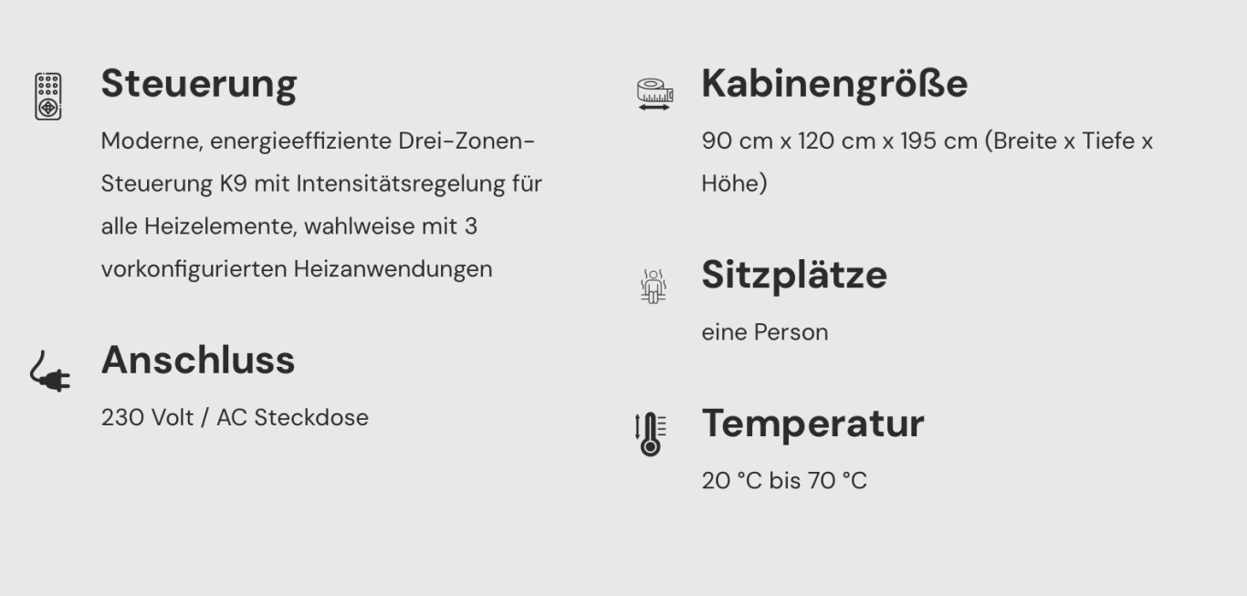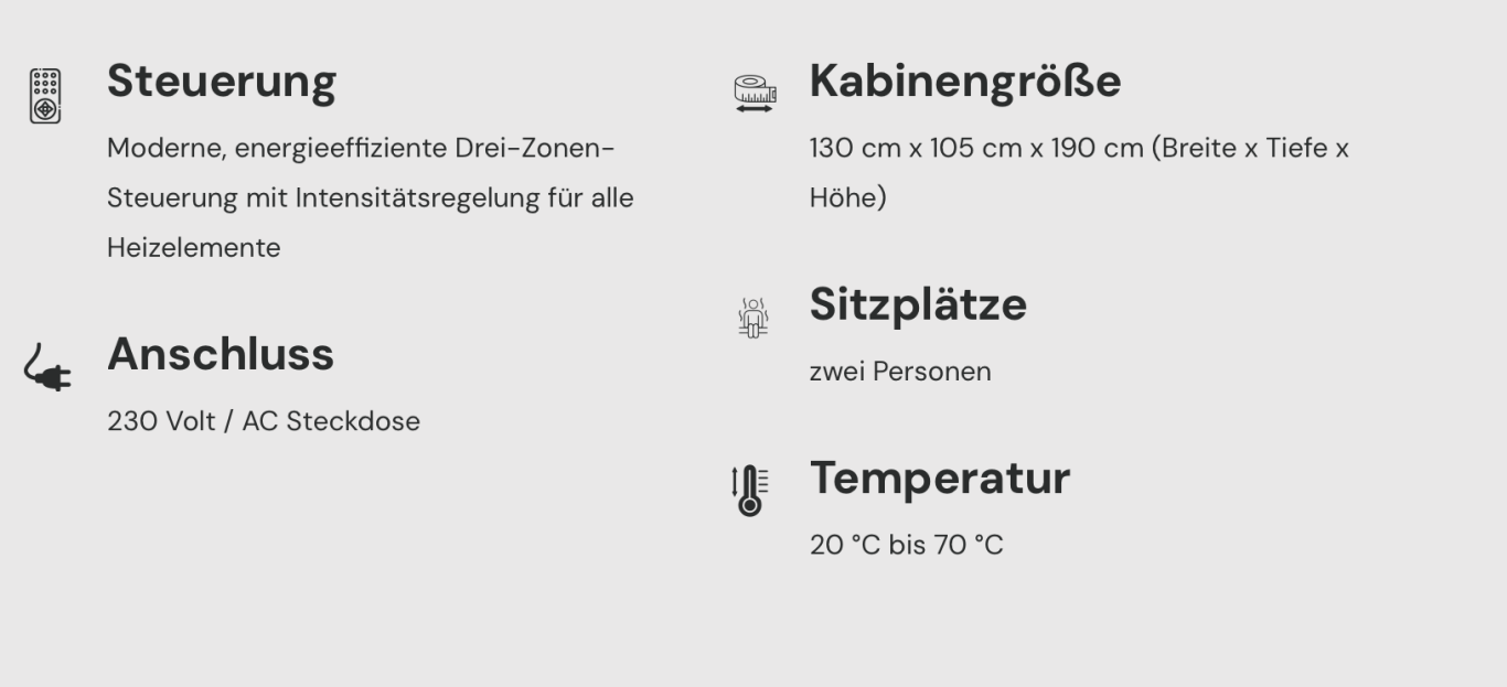 Unsere TÜV-geprüften Infrarotkabinen sind steckerfertig (230 V), energieeffizient und in verschiedenen Größen erhältlich – von der kompakten 1-Personen-Kabine bis zur großzügigen 3-Personen-Sauna.