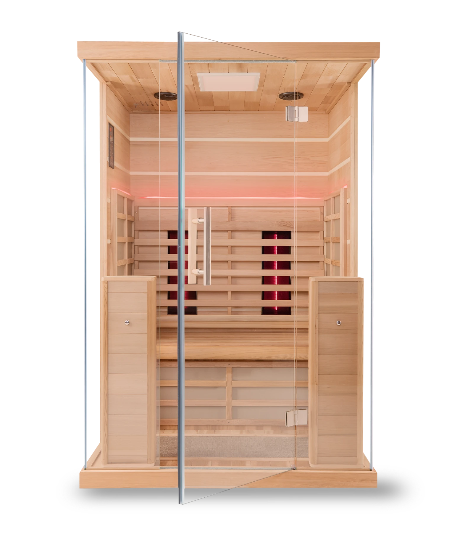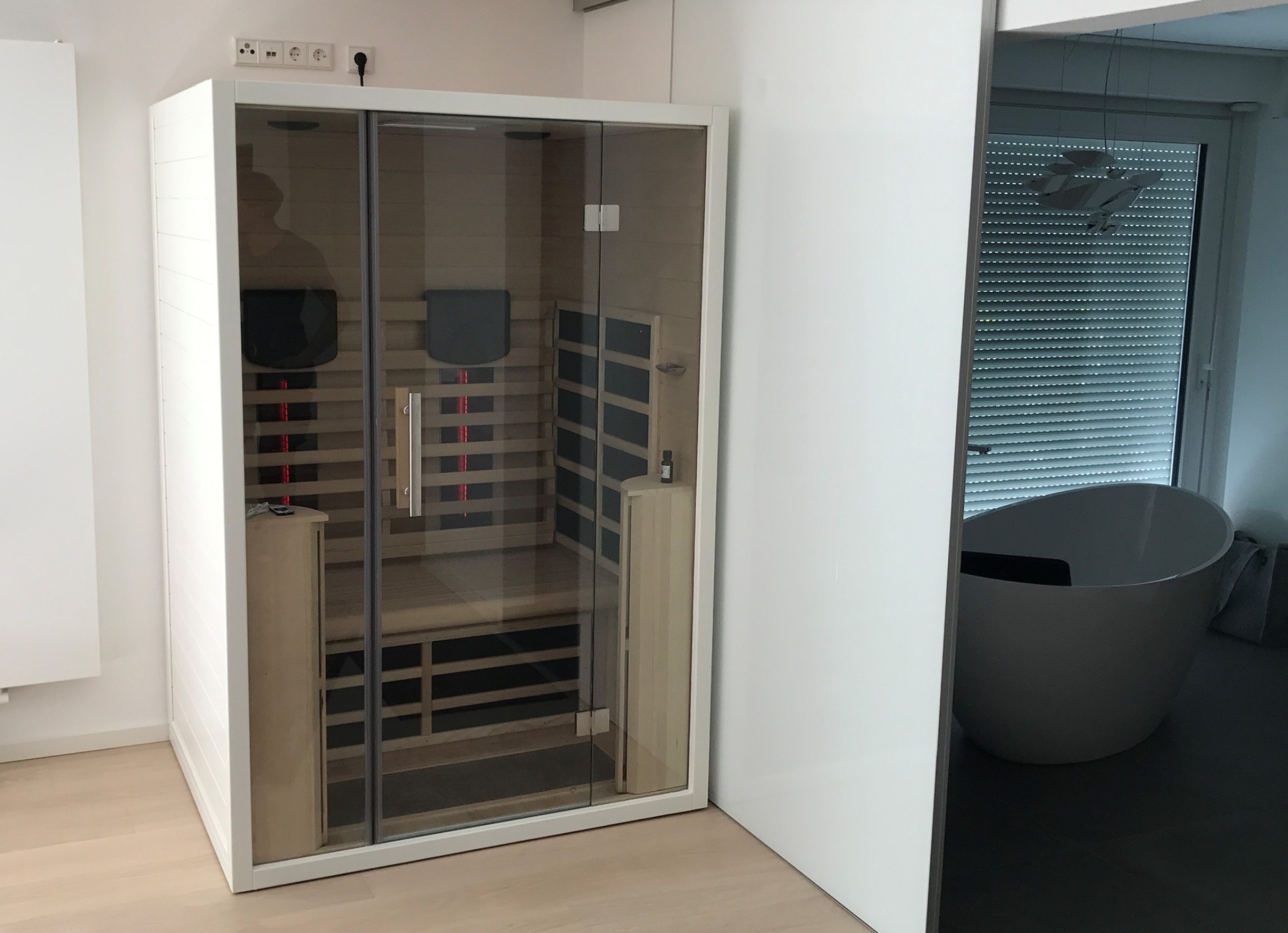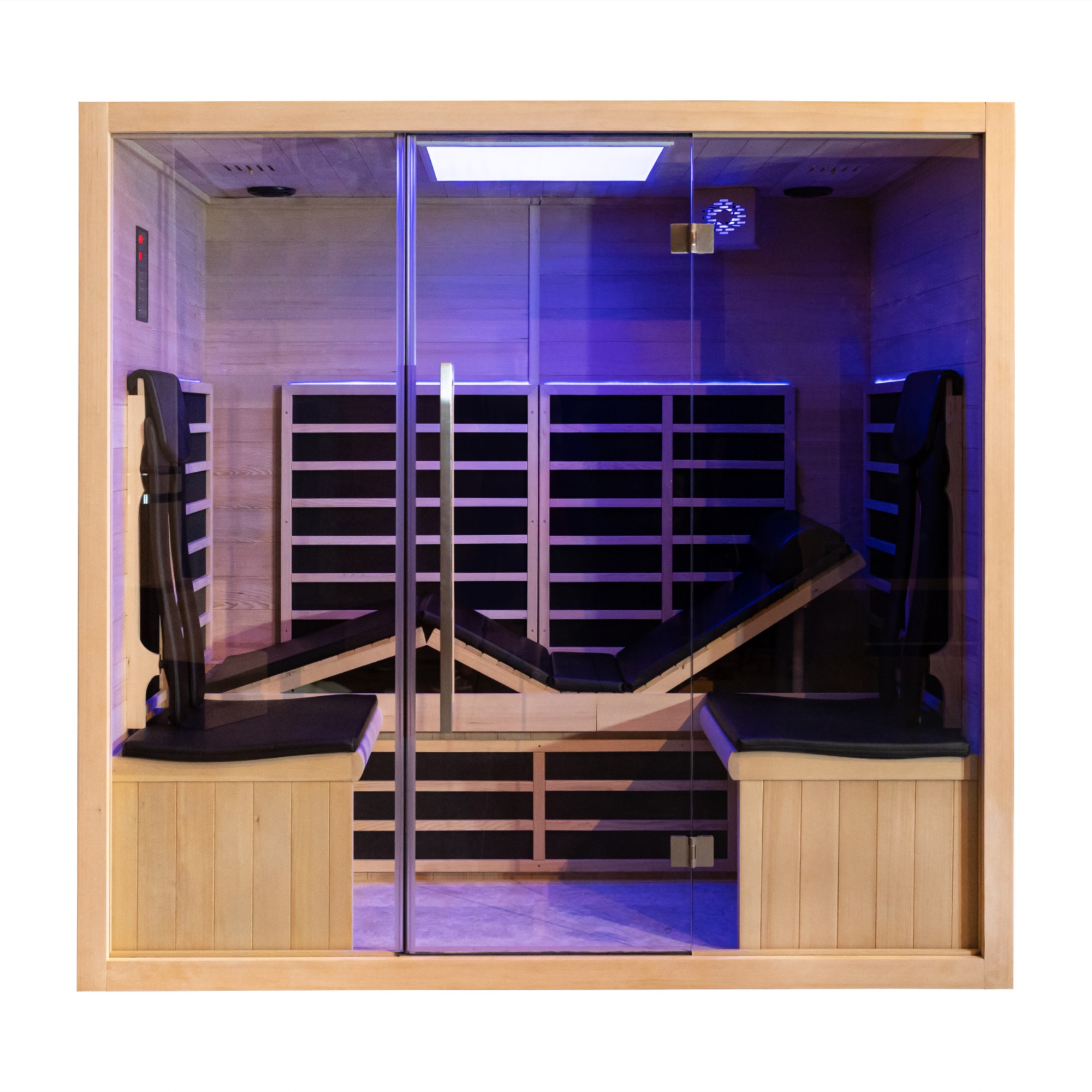 Unsere TÜV-geprüften Infrarotkabinen sind steckerfertig (230 V), energieeffizient und in verschiedenen Größen erhältlich – von der kompakten 1-Personen-Kabine bis zur großzügigen 3-Personen-Sauna.